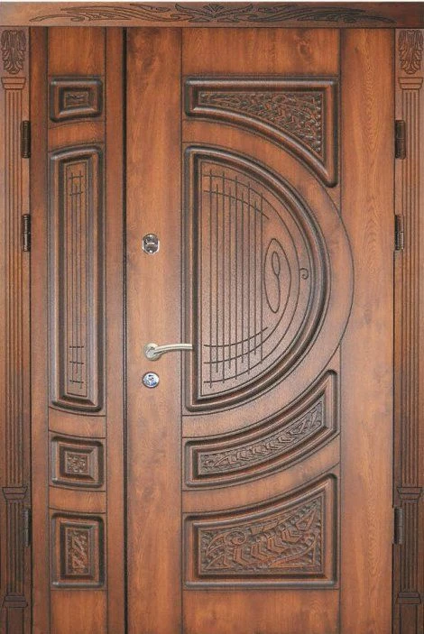 Поскольку в большинстве случаев устанавливаемые на входе в коттедж двустворчатые двери являются еще и предметом интерьера, украшающим здание, их дизайну предается особое значение. Эти двери, как правило, отделываются атмосферостойким МДФ, натуральным шпоном, массивом. Эффектно на таких дверях смотрится витражный узор, применение ковки, зеркальных элементов. Вариантов декора входной двустворчатой двери масса, тут все зависит от пожеланий заказчика.